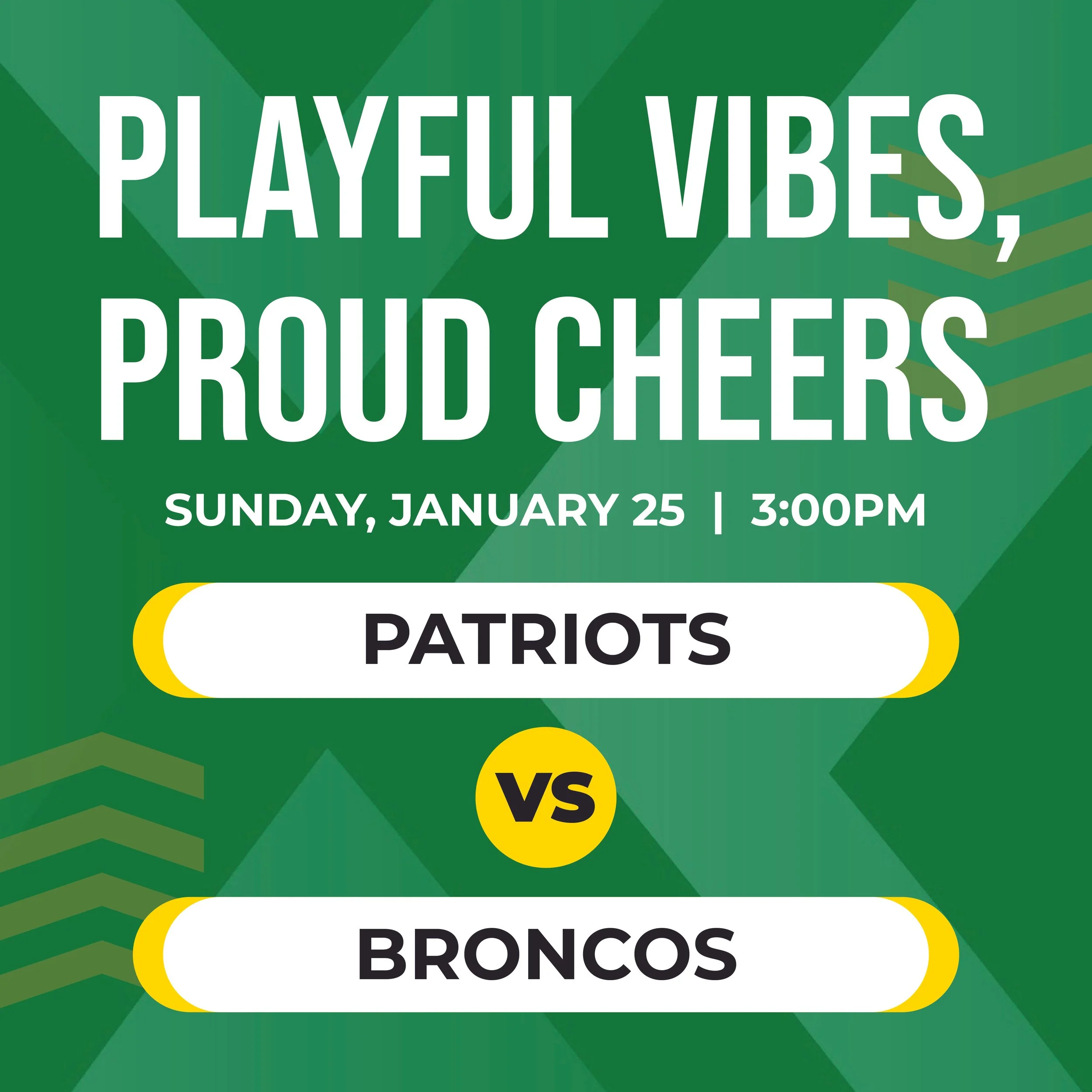 Huddle up for an afternoon of cheers, chills and thrilling AFC Championship action in a fun, welcoming and proudly inclusive space! Fuel your fandom with a plate of nachos or New England Clam Chowder, sip a cold one and catch the big game kicking off at 3 PM. Grab your jersey, bring your crew (all are welcome) and stick around through the final whistle — because Sundays were made for football, friends and feasting.